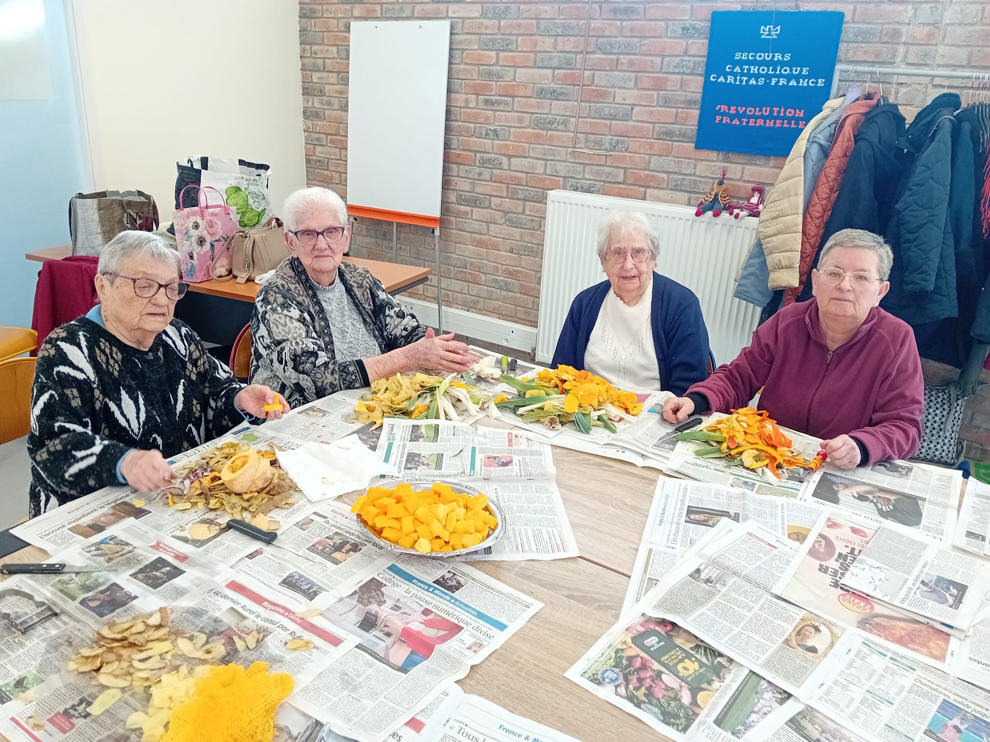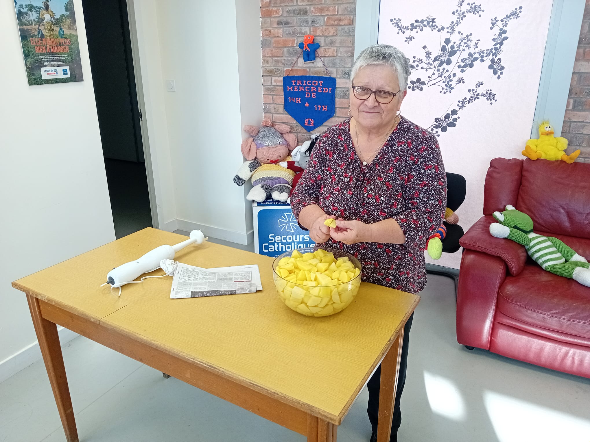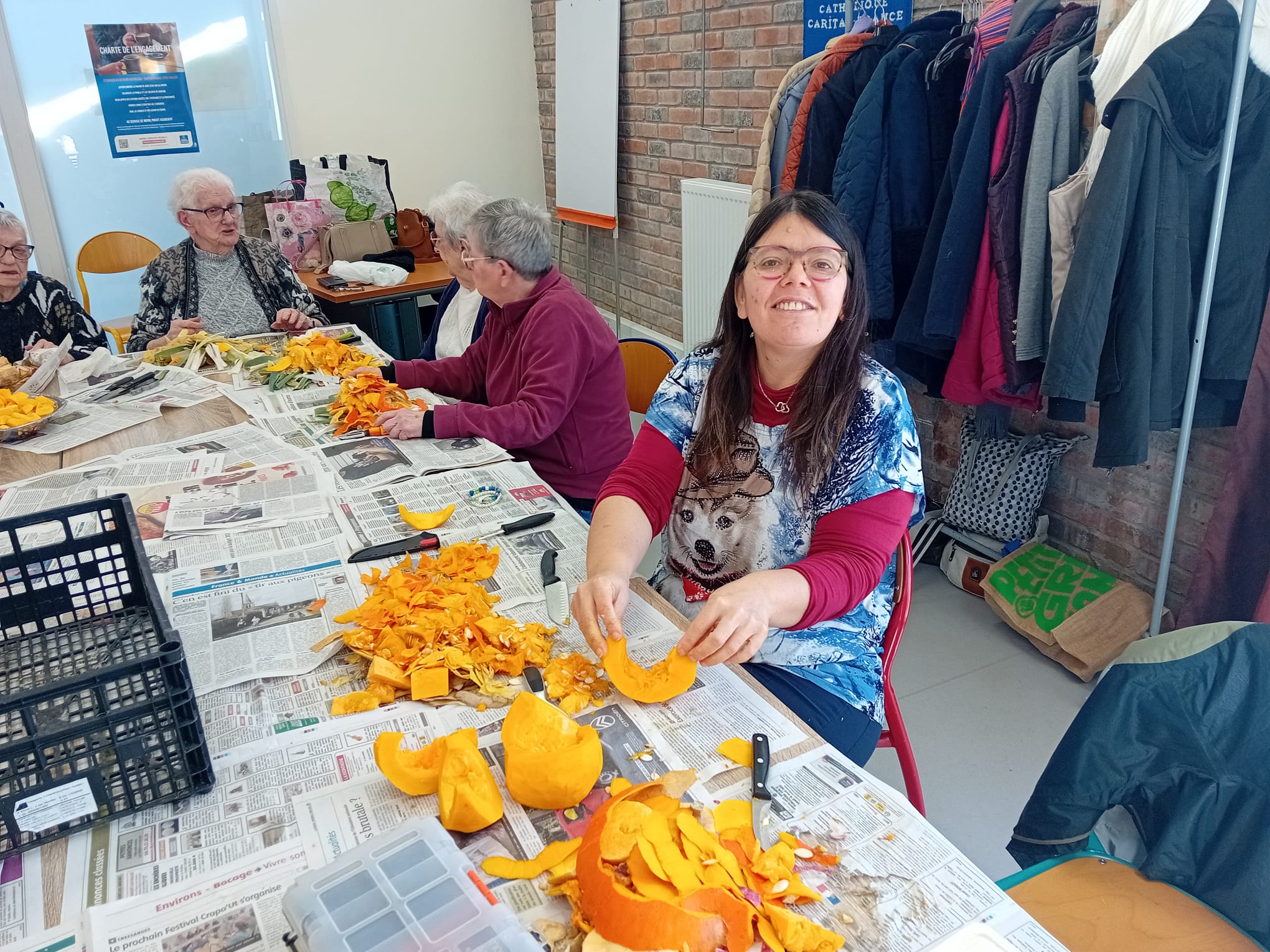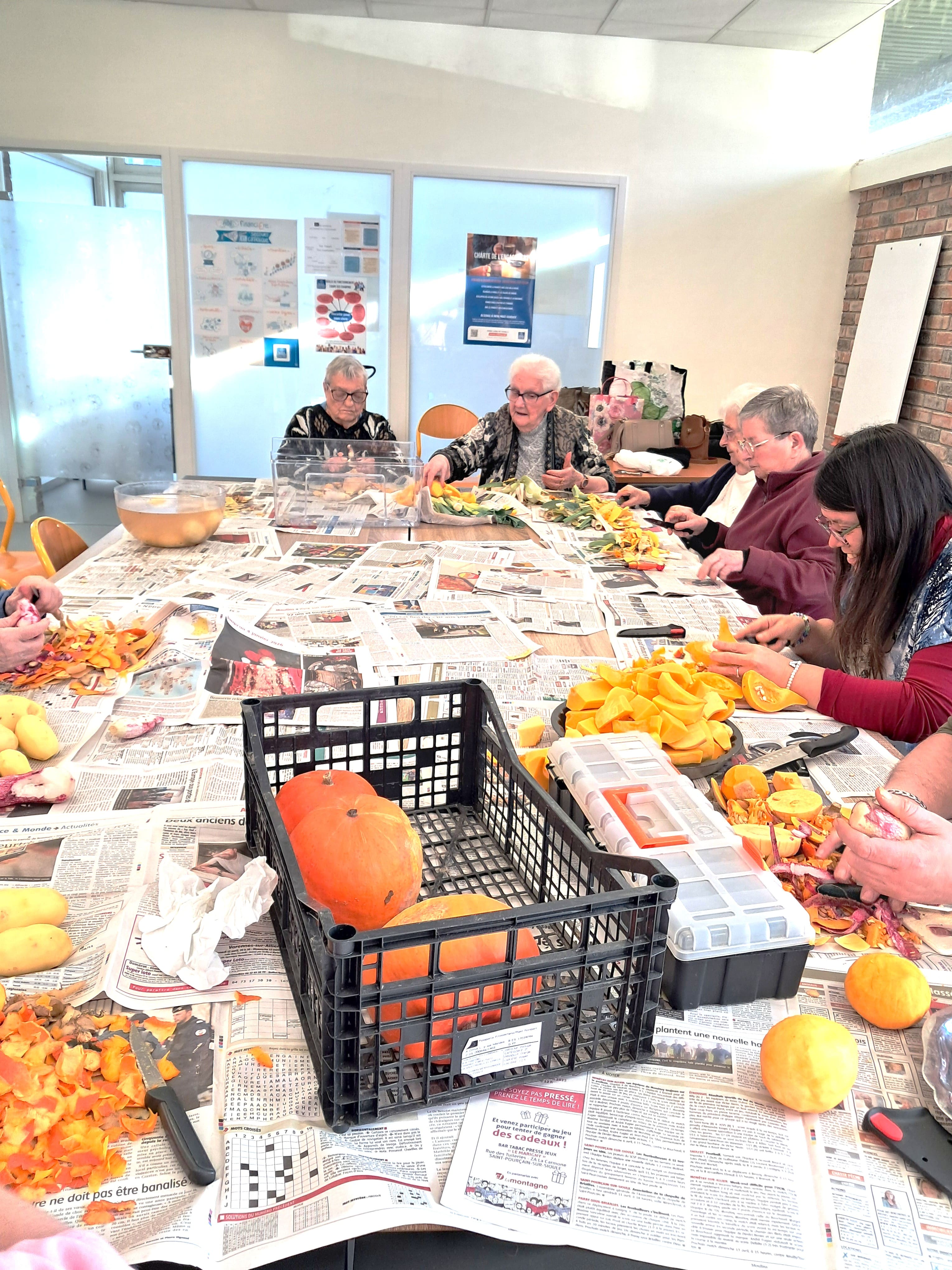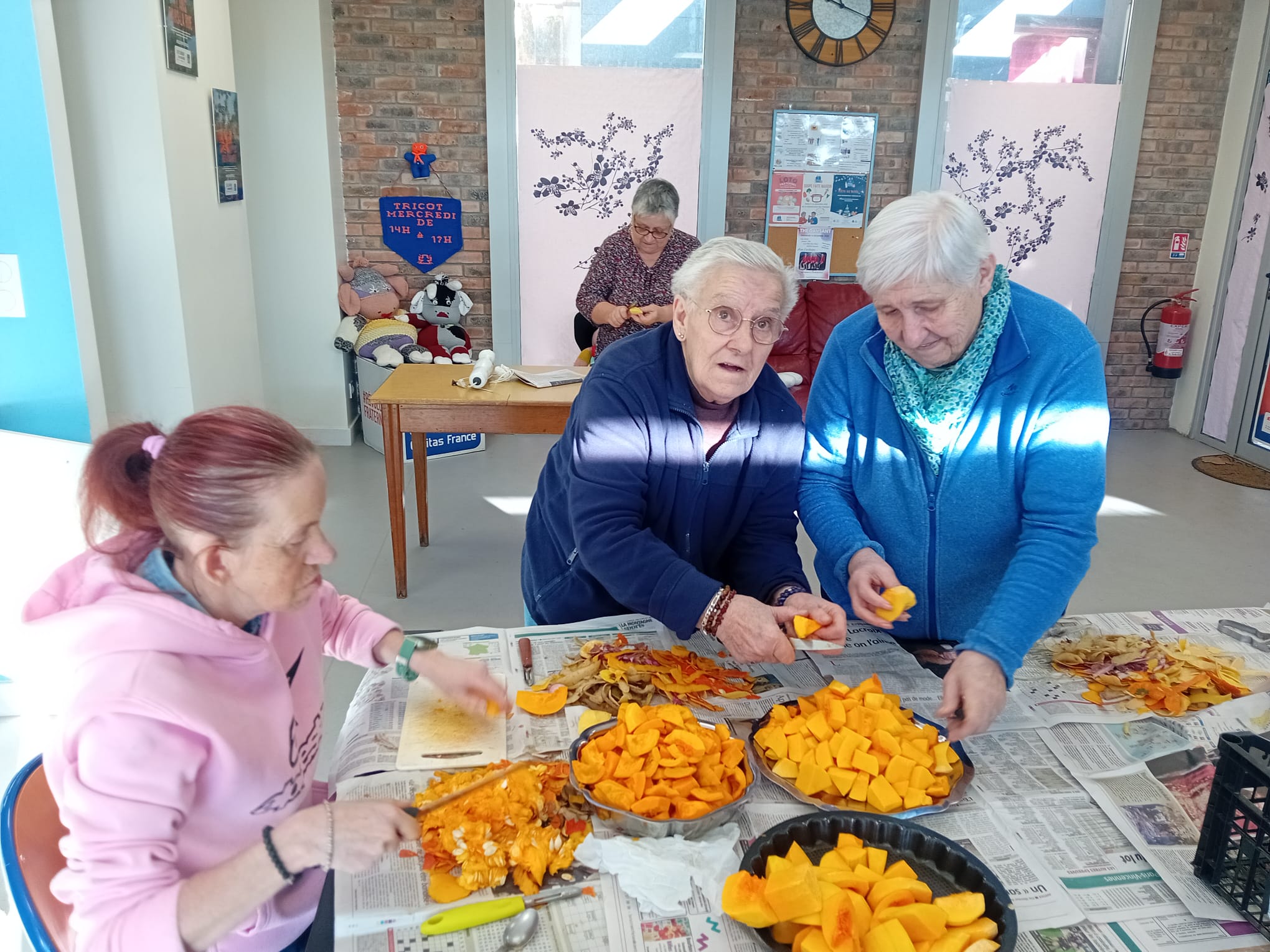 « L’atelier Belote du lundi s’est transformé en atelier soupe. Aux beloteurs se sont joints des bénévoles et d’autres personnes accueillies. La bonne humeur et la convivialité ont rythmé l’épluchage des légumes du jardin, la préparation de la soupe et la mise en bouteilles. Le mardi, c’était la vente au marché des Champins : toutes les soupes ont été vendues. Tous les participants ont apprécié ce moment de partage et se donnent rendez-vous pour un autre moment tout aussi fraternel. »